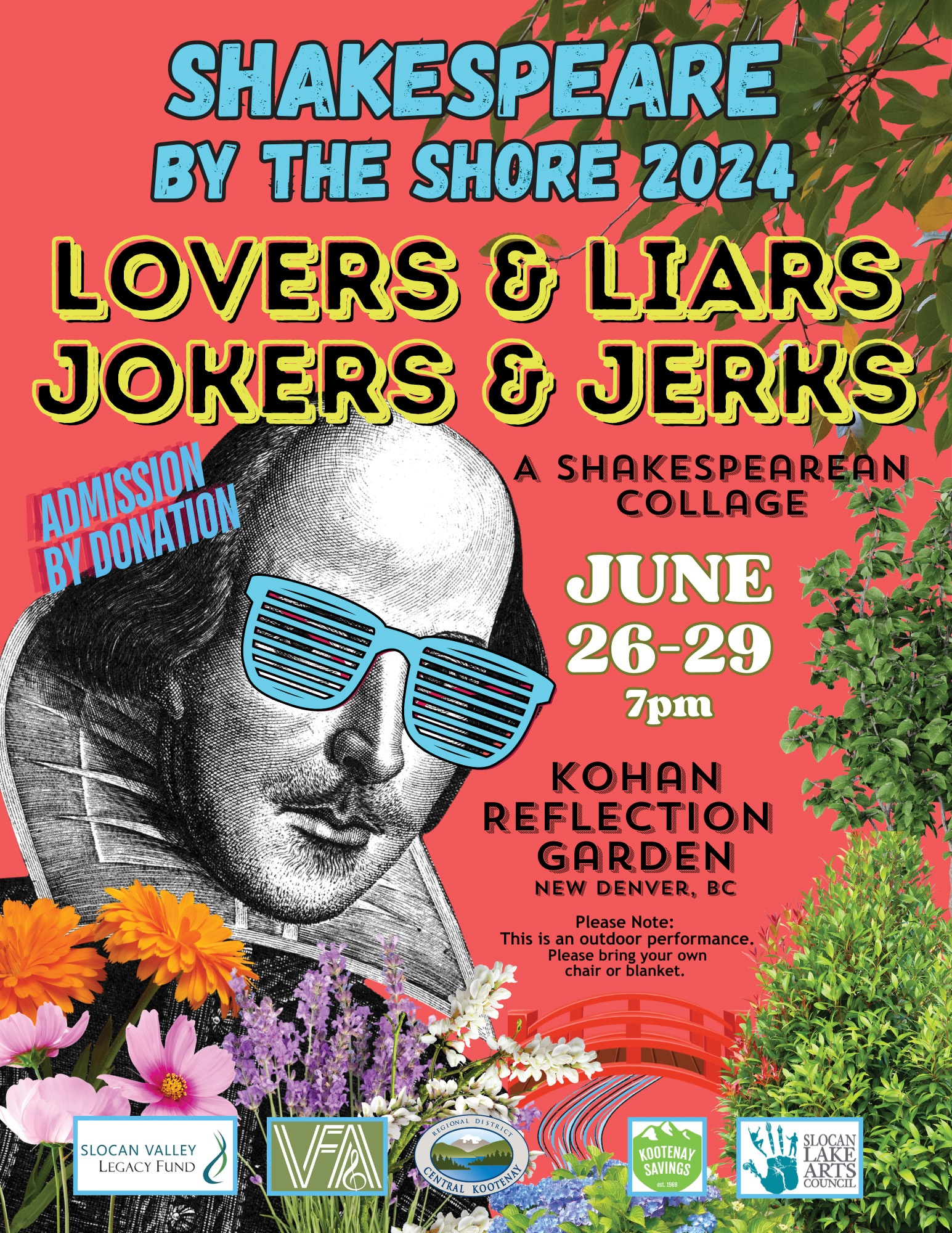 Shakespeare by the Shore presents Lovers and Liars, Jokers and Jerks on June 26th, 27th, 28th and 29th, in the Kohan Garden, New Denver.