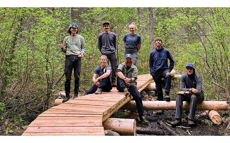 Over five years, the program has created 66 jobs in the Basin, covering four recreation districts and overseeing 557 recreation sites and trails. For the 2024 field season, the four crews will have three members each, creating 12 seasonal positions in the Basin. Crew members gain useful skills and leadership experiences that will forever come in handy, while also having fun camping and making friends. “The campout trips have been a highlight! Doing big crew cookouts, having crib and Yahtzee tournaments after a day of trail building was really fun,” says Dexter Gauthier, crew leader for the Cranbrook crew in 2023. Based out of Cranbrook, Nelson, Revelstoke and Invermere, crew members and leaders are hired for about four months of field work. Training has a strong emphasis on safety in an outdoor setting, such as the proper use of hand tools, trail building, first aid, two-way radio communications and wildlife safety. “Most of our crew members come from an environmental background, which means they’re very capable in the outdoors. Our training builds on the skills they already have,” says Eskelin. Once crews are trained, boots hit the ground. Following project lists developed by area recreation officers, and working alongside local clubs and volunteers, the crews undertake tasks that range from reconnaissance and scouting to tree planting, to the installation of much-needed infrastructure like bridges, boardwalks, and tent pads.